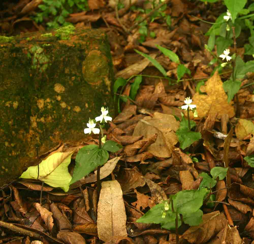 Found in Guinea, Sierra Leone, Liberia, Ivory Coast, Ghana, Togo, Nigeria, Gulf of Guinea Islands, Cameroon, Zaire, Kenya, Tanzania, Malawi, Zambia and Angola in very wet relict gallery rainforests in leaf litter at elevations around 1200 meters as a miniature sized, cool growing terrestrial with 2 oppostie, corrugated margins, deep green above and purple beneath leaves that blooms in the summer on an erect, 2 to 4 flowered inflorescence carrying white and green flowers