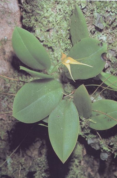 Found in Tutuila, Samoa and Niue in ridge forests on tree trunks at elevations of 130 to 270 meters as a mini-miniature to miniature sized, hot growing epiphyte with a short, ascending rhizome giving rise to distichously arranged, proximate, subspherical, angular pseudobulbs carrying coriaceous, elliptic to elliptic-obovate, obtuse to subacute leaf that blooms on a basal, erect, much longer than the leaf, glabrous, 2.2" [5.5 cm] long, single flowered inflorescence with sheathing, acute to acuminate, floral bracts and carrying a yellow flower.