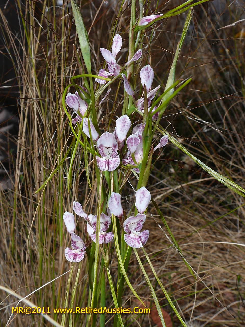 Found in New South Wales Australia as a small to medium sized, cold growing terrestrial species found in Callitris woodlands among grass at elevations of 100 to 140 meters with 2 to 3, conduplicate, straight, linear leaves that blooms in the later spring on an erect, 12 to 20" [30 to 50 cm] long, 3 to 9 flowered inflorescence aqnd carrying slightly fragrant flowers.