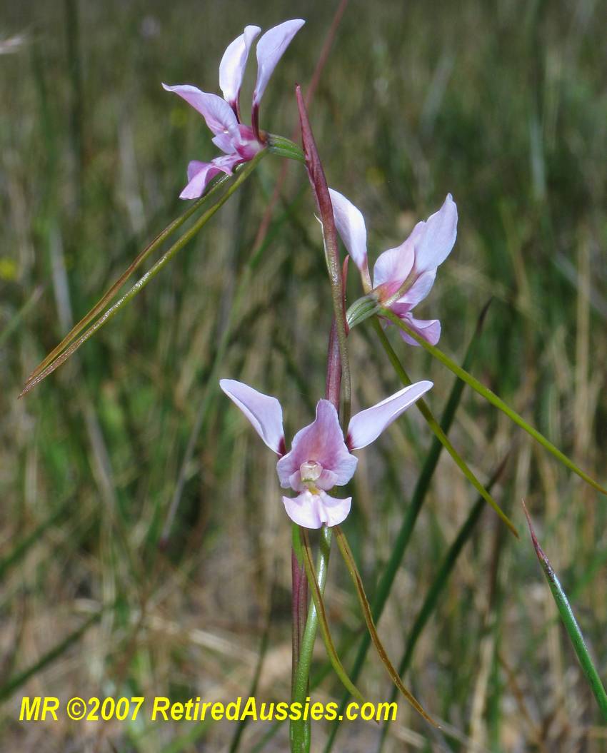Found in Victoria Australia as a small to medium sized, cold growing terrestrial species found in heathy forests and grassy river red Gum woodlands at elevations of 20 to 250 meters with 2, conduplicate, straight, linear leaves that blooms in the spring on an erect, 12 to 20" [30 to 50 cm] long, 1 to 7 flowered inflorescence carrying fragrant flowers.