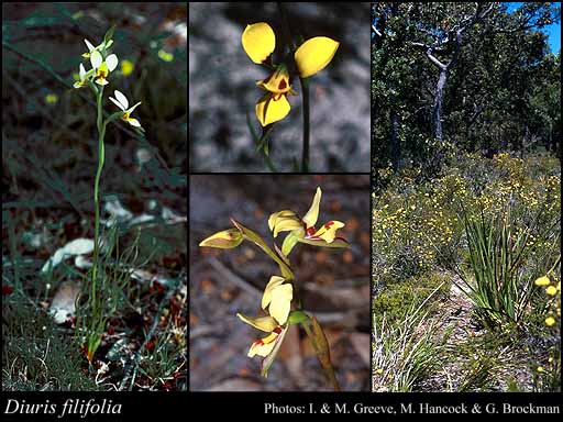 Diuris filifolia Lindl. 1840Photography by © I & M Greeve, M Hancock and G Brockman . Image used with the permission of the Western Australian Herbarium, Department of Environment and Conservation (http://florabase.dec.wa.gov.au/help/copyright). Accessed on Wednesday, 29 August 2012 and The Flora Base Website