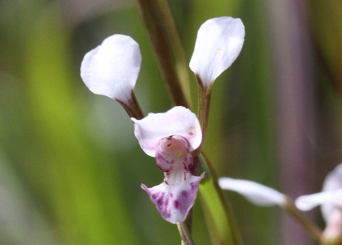 Found in Queensland on ridges and slopes in sparse grassy forests at elevations of 700 to 1200 meters as a miniature to small sized, cool growing terrestrial with a folded, basally purplish leaf that blooms in the fall on a 8 to 165" [20 to 40 cm] long, 1 to 10 flowered inflorescence