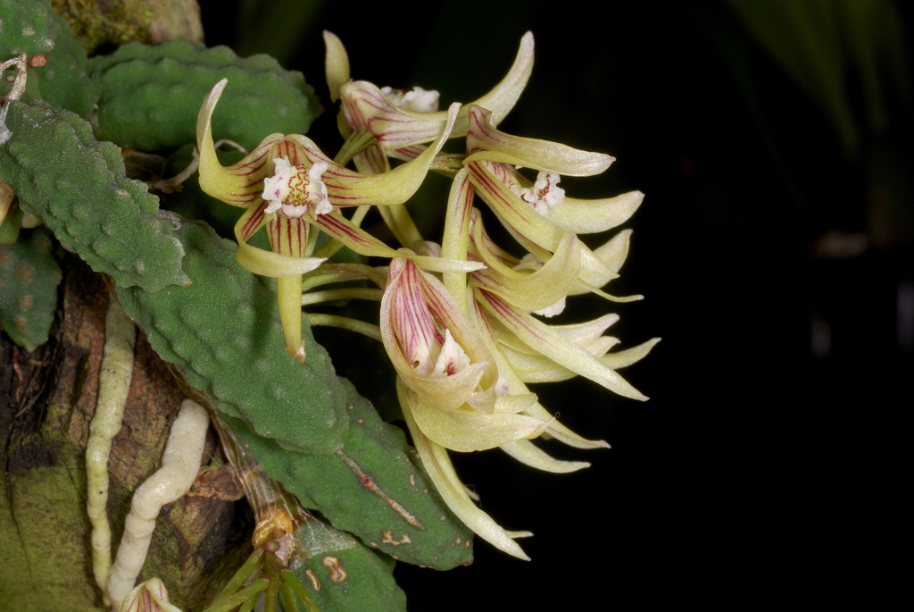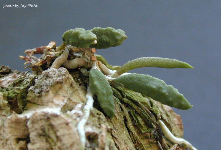 Found in Queensland Australia, as a miniature sized, cool to hot growing epiphytic species on river oaks near watercourses at elevations of 50 to 800 meters that has short, cane-like pseudobulbs and cucumber like leaves on a slender creeping rhizome. The short to 1" [to 2.5 cm], erect inflorescence gives rise to a small group of short lived, foul smelling flowers which occur in the late winter and spring.