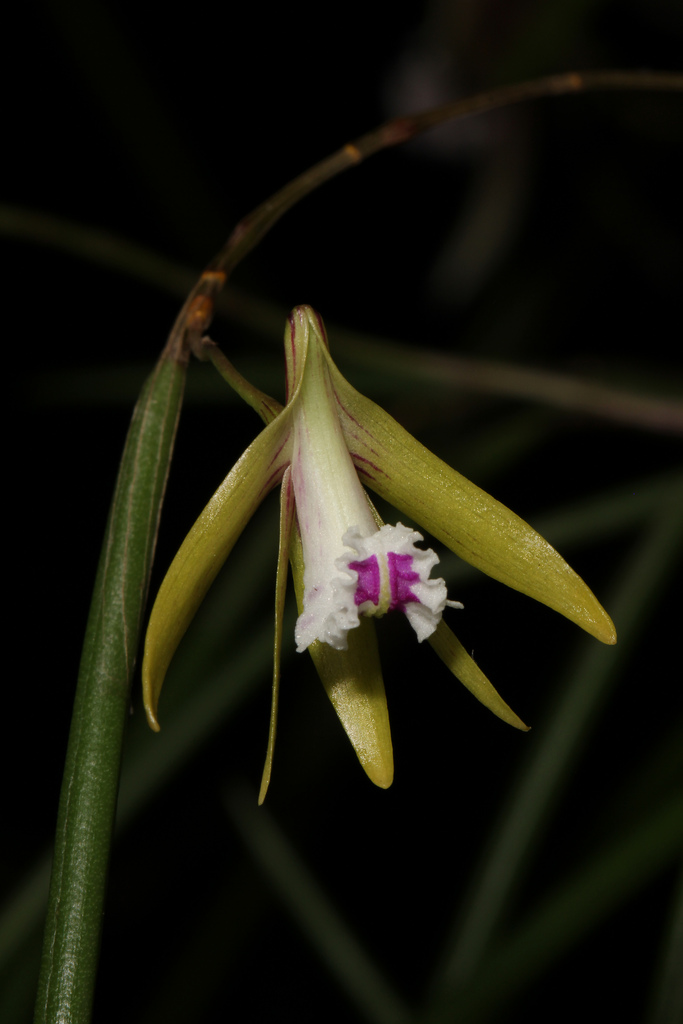 Found in New Caledonia and Queensland and New South Wales Australia as a small to medium sized, pendulous growing epiphyte or lithophyte of cool rainforests on moss covered trees at elevations of 300 to 900 meters with slender, terete, grooved leaves and blooms on a short, single flowered inflorescence that gives rise to fragrant, non-resupinate flowers occuring in the spring.