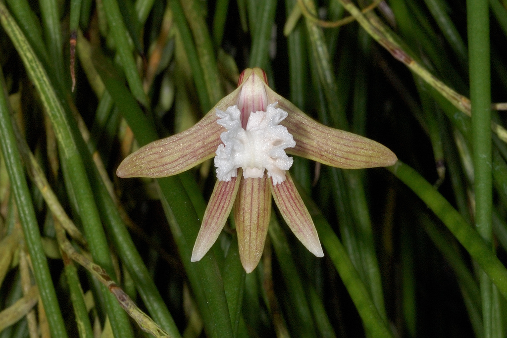 A lithophytic, Australian species found from New South Wales, Victoria and Tasmania Australia on cliff faces and granite boulders up to 1000 meters in elevation in exposed locations, and is a mini-miniature sized, warm to cold growing lithophyte with sympodial, pendulous stems carrying a single, apical, terete, dorsally grooved leaf that blooms in the spring with a 1 3/5" to 4 1/4" [4 to 11 cm] long, slender stemmed raceme with 1 to 2, non-resupinate fragrant flowers.