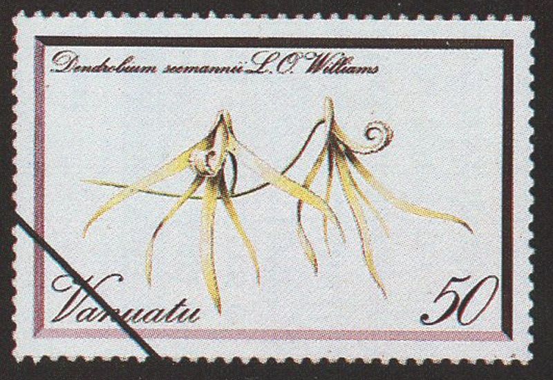 References W3 Tropicos, Kew Monocot list , IPNI ; AOS Bulletin Vol 51 #12 1982 as Dendrobium seemanii postage stamp fide; Orchids of Vanuatu Lewis & Cribb 1989 as D seemanii; Orchids of Sasmoa Cribb & Whistler 1996;