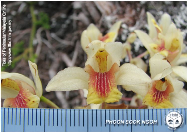 Found in Malaya, Borneo and Sumatra at elevations around 1550 to 2200 meters in montane forests on mountain ridges in high open places as a large sized, monopodial, cool to cold growing epiphyte or terrestrial in peat bogs or sphagnum moss banks with an elongate bamboo-like stem carrying many, rather stiff, articulated to the stem , narrowly pointed leaves and a terminal, rather compact, several branched, to 12" [to 30 cm] long, several to many successively flowered so it lasts for months, erect to decurved inflorescence with creamy colored bracts and short-lived, cup shaped flowers occuring in the summer .
