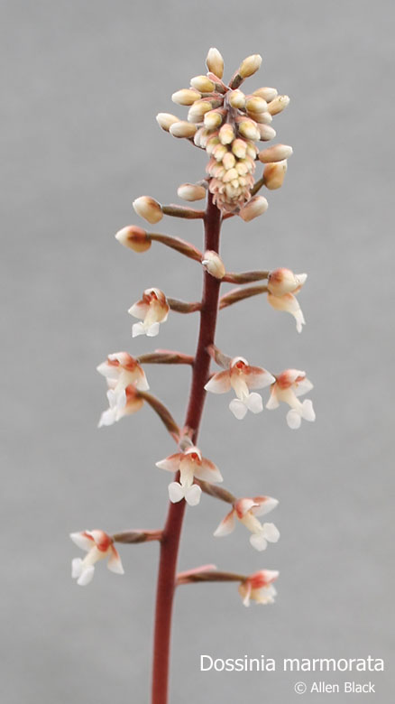 Found only in Borneo in lowland and hill forests on limestone with leaf litter and or moss or between rocks and on ledges at elevations of sealevel to 400 meters as a miniature to small sized, hot growing terrestrial orchid with a short, stem with wooly roots and carrying 3 to 5, basally grouped, ovate to broadly elliptic,, fleshy, 5 to 7 nerved, top black green with irridescent pink, greenish yellow to golden reticulation, dorsally pink to purple, abruptly narrowing below into the petiolate base leaves that blooms in the fall, winter and spring on a terminal, erect, laxly to densely many flowered, 9.2 to 24" [23 to 60 cm] long, densely, shortly pubescent inflorescence with narrwoly elliptic, acute to acuminate, densely shortly pubescent, membraneoius, pink floral bracts.