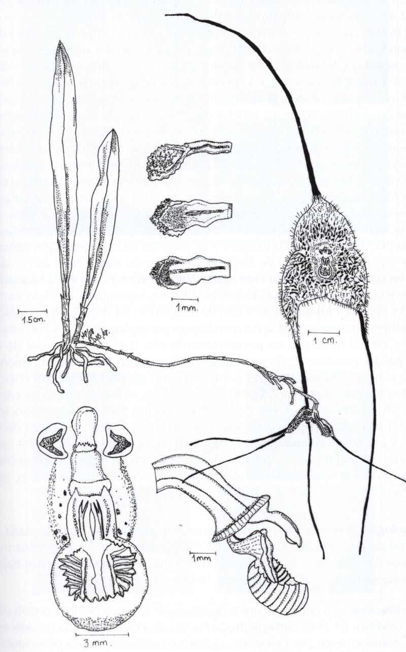 Found in the Narino department in southern Colombia at elevations around 2000 meters as a small sized, cool to cold growing epiphyte with an erect, short, stout ramicaul enveloped by 2 to 3 tubular, loose sheaths and carrying a single, apical, erect, carinate, thinly coriaceous, narrowly elliptic, subplicate, acute, gradually narrrowing below into the subpetiolste base leaf that blooms in the late spring and summer on an horizontal to descending, dark green spotted purple, 4 to 4.6" [10 to 11.6 cm] long, successively single flowered inflorescence arising from the base of the ramicaul with many brown, tubular bracts and carrying a faintly fragrant flower