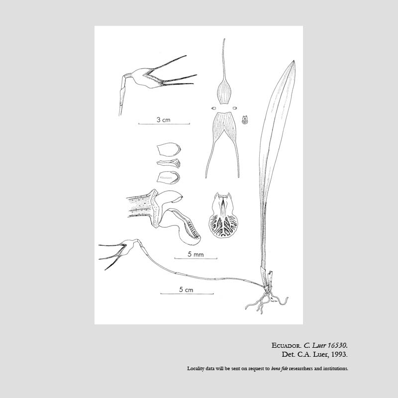 References W3 Tropicos, Kew Monocot list , IPNI ; *Icones Pleurothallidinarum X Systematics of Dracula Luer 1993 drawing fide; Thesaurus Dracularum Vol 7 Luer, Escobar and Dalstroem 1994 drawing fide; Draculas Del Ecuador Pupulin, Merino and Medina 2009; Flora of Ecuador No 87 225[3] Orchidaceae Dodson & Luer 2010