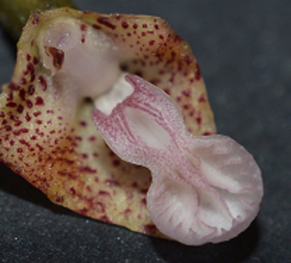 Found in in Ecuador in the Tulcan Region of Carchi Province at elevations around 1500 meters as a small to just medium sized, cool growing epiphyte with erect, coriaceous, carinate, elliptic to ovate, acute leaves that blooms in the in the late fall and early winter on an ascending-horizontal to descending, 6.8 to 10" [17 to 25 cm] long overall, rachis .8 to 2" [2 to 5 cm] long, successively single, 2 to more flowered inflorescence carrying flowers with a subpandurate lip, .28" x .2" [7mm x 5 mm], that has an orbicular epichile with 3 distinctive lamellae.