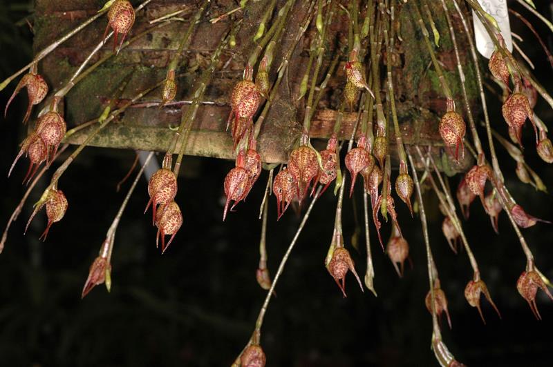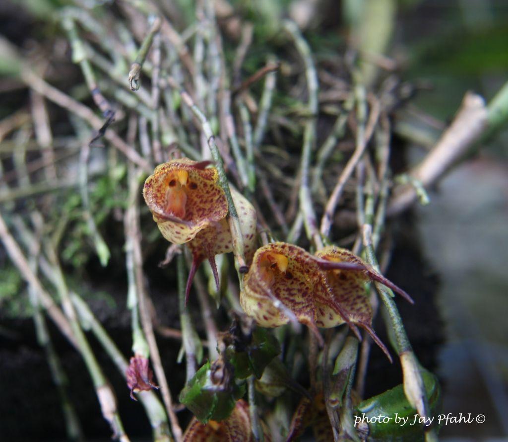 Found in southern Ecuador in montane cloud forests at elevations of 400 to 1500 meters as a miniature to small sized, hot to cool growing epiphyte with a very short ramicaul enveloped basally by 2 to 3 acuminate, tubular sheaths and carrying a single, apical, erect, narrowly elliptic, conduplicate below into the petiolate base leaf that blooms in the winter through summer in situ on a pendant, to 6” [15 cm] long, bracteate, successively 1, 2 flowered inflorescence that arises from the base of the ramicaul.
