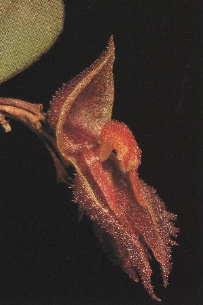 Found in southern Ecuador in very cold wet cloud forests at elevations of 2600 to 3200 meters as a mini-miniature sized, cold growing epiphyte with erect to horizontal, slender ramicauls enveloped by 4 to 7, pubescent, lepanthiform sheaths with dilated ostia and carrying a single, erect, coriaceous, purple below, narrowly elliptical, acute, cuneate below into the petiolate base leaf that blooms in the late winter and early spring on a behind the leaf, sublax, 1" [2.5 cm] long, successively few flowered inflorescence often with 2 flowers open at any one time.