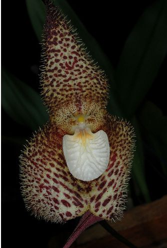 Found in Antioquia department of Colombia without locality as a small to just medium sized, cool to cold growing epiphyte with stout, channeled ramicauls enveloped by 2 to 3 loose, tubular sheaths and carrying a single, apical, erect, coriaceous, more or less plicate, carinate dorsally, obovate, tridenticulate and subacute apically, gradually narrowing below into the indistinct, conduplicate, petiolate base leaf that blooms in the summer on a descending, 8 to 18" [20 to 45 cm] long, to 3 distantly flowered inflroescence with sparsely spaced bracts and a floral bract.
