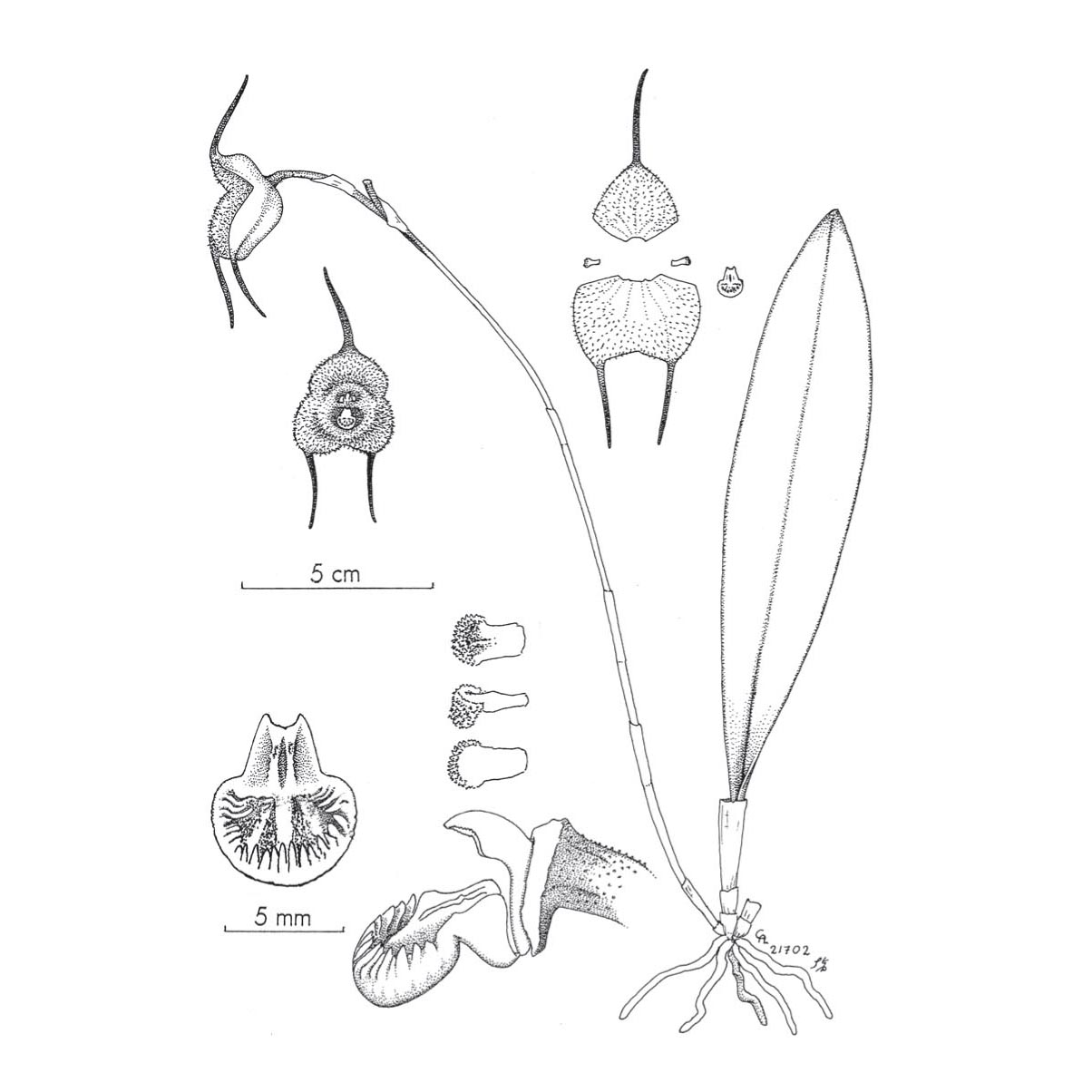 Found in Ecuador without collection data as a small sized, cool growing epiphyte with very thick roots giving rise to stout, erect ramicauls enveloped by loose, tubular sheaths and carrying a single, apical, erect, thinly coriaceous, elliptical, acute, cuneate below into the condupicate, shortly petiolate base leaf that blooms in the summer on a more or less horizontal, arising from the base of the ramicaul, peduncle sparsely bracted, to 8" [20 cm] long, loose, successively single, few flowered inflorescence with tubular acute floral bracts