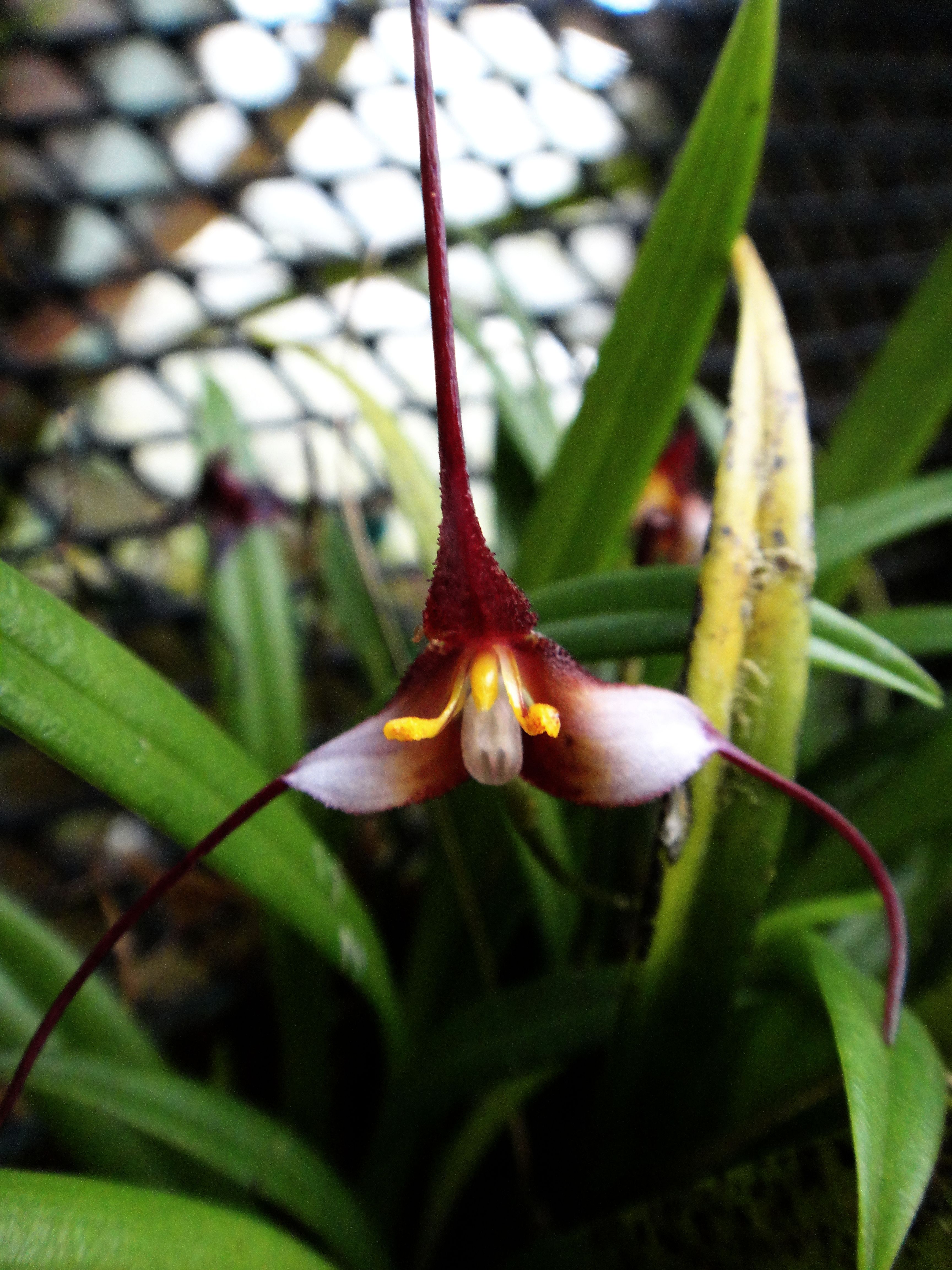 Found in Putumayo department of Colombia on the eastern slopes of the Andes in remnants of cloud forest at elevations around 2200 meters as a miniature sized, cold growing epiphyte with slender, erect ramicauls enveloped basally by 2 to 3, short, tubular sheaths and carrying a single, apical, erect, thinly coriaceous, carinate, narrowly elliptical, acute, gradually narrowing below into the subpetiolate base leaf that blooms in the spring and summer on a slender, 3.2 " to 4.4" [8 to 11 cm] long, lax, successively few flowered, racemose inflorescence arising from low on the ramicaul and carrying tubular floral bracts.
