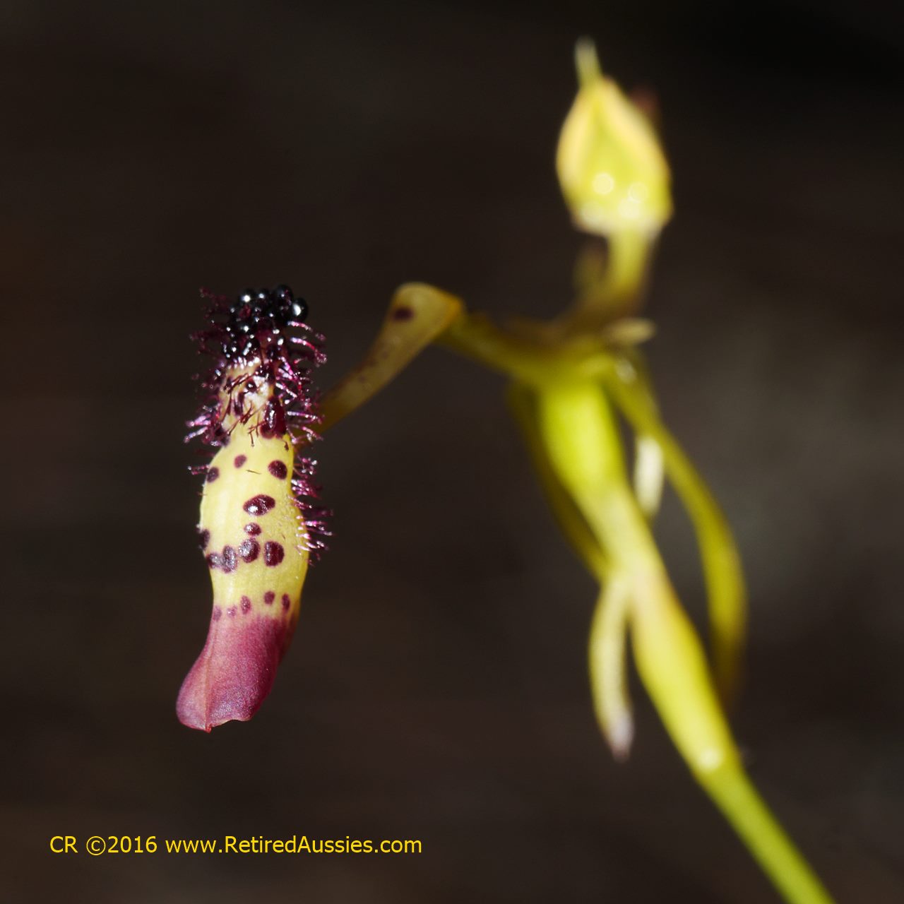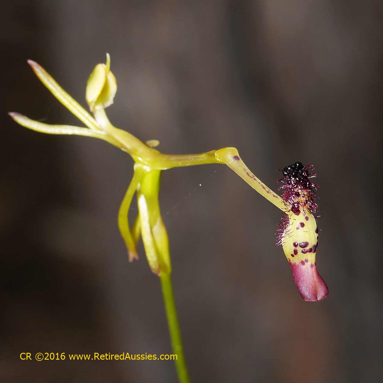 Found in southwestern Western Australia in Jarrah forests and Banksia woodlands at elevations of 100 to 400 meters as a small sized, cold growing terrestrial with a dark green, often densely hairy leaf that blooms in the spring on an erect, 6 to 12" [15 to 30 cm] long, single flowered inflorescence.