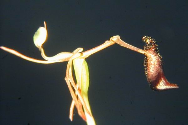 Found in southwest Western Australia in Jarah forests in mossy pockets at elevations of 20 to 500 meters as a miniature to small sized, cold growing terrestrial with a single, greyish green leaf that blooms in the late winter through midspring on an erect, 4 to 10" [10 to 25 cm] long, single flowered inflorescence.