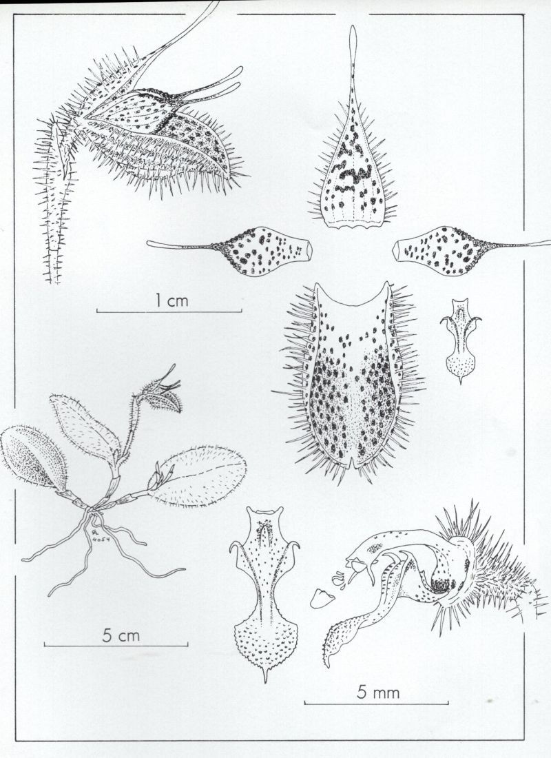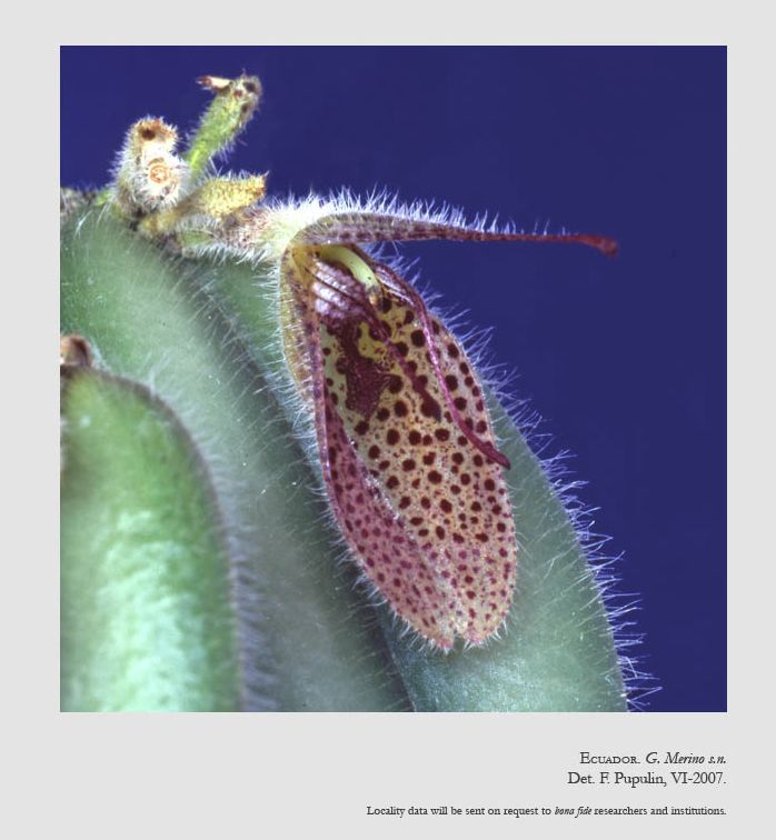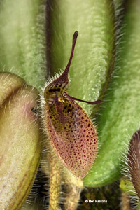 Found in Peru and Ecuador as a miniature sized, warm to cool growing epiphyte at elevations of 900 to 1800 meters with horizontal to suberect, stout ramicauls enveloped by 3 fugacious, pilose, imbricating sheaths and carrying a single, apical, suberect to horizontal, fleshy, verruculose, elliptical, obtuse,light green, speckled with purple underneath, gradually narrowing below into the broadly cuneate, short petiolate base leaf that is covered on both sides by white trichomes that blooms at any time of the year on a short to 1/2" [12 to 14 mm] long, slender, pubescent, successively single flowered inflorescence arising from the leaf base.