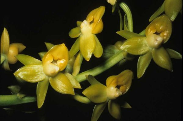 Found in Peru in wet montane forests as a caespitose, warm growing epiphyte at elevations of 600 to 950 meters with clustered, fusiform pseudobulbs enveloped basally by several distichous, imbricating, articulated, foliaceous sheaths and carrying deciduous, plicate, elliptic-lanceolate to oblanceolate, acute leaves tapering to a channeled petiolate base and blooms in nature in the winter and early spring with 5 to 10, strongly fragrant, non-resupinate flowers on a stout, arching, basal, 8" [20 cm] long, lateral racemose inflorescence arising on a newly forming pseudobulb.