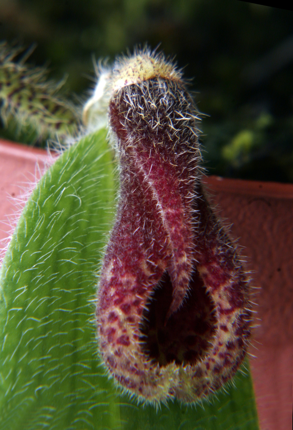Found in southeastern Ecuador at elevations around 1700 to 1800 meters as a mini-miniature sized, cool growing epiphyte with horizontal to erect, stout ramicauls enveloped by 3 to 4, fugacious, pubescent, imbricating sheaths and carrying a single, apical, erect, thickly coriaceous, dark green, white pilose, elliptical, acute leaf that blooms in the spring on a stout, .1" [3 mm] long, successively single flowered inflorescence.