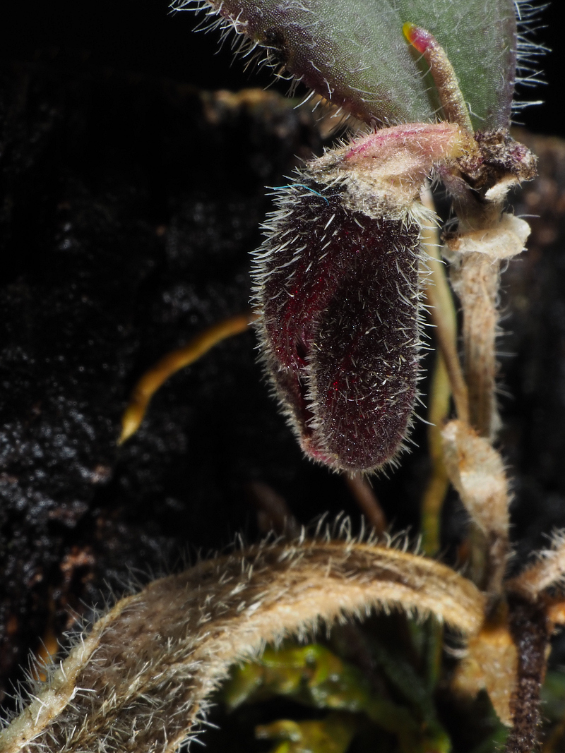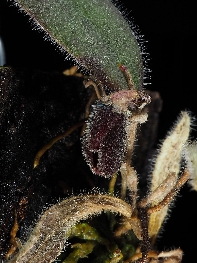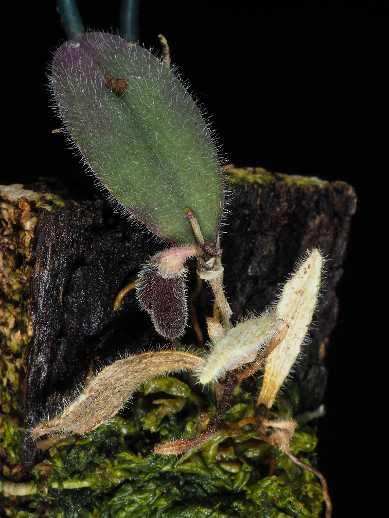Found in Zamora-Chinchipe province of Ecuador in cloud forests at elevations around 1700 meters as a mini-miniature sized, cool growing epiphyte with erect, suberect to horizontal, stout ramicauls enveloped by 3 to 4, pubescent, imbricating sheaths and carrying a single, apical, erect, coriaceous, covered on both sides by white trichomes, elliptic-oblong, subacute, cuneate below into the sessile base leaf that blooms in the spring on a stout, .04 to .08" [1 to 2 mm] long inflorescence with a succession of single flowers arising through a sheath at the base of the leaf with a long-pubescent floral bract.