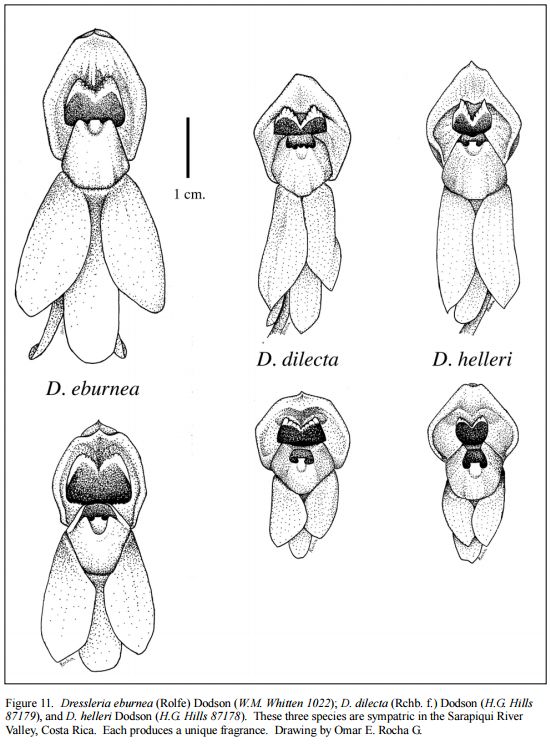 "Dressleria helleri is most similar to D. dilecta and primarily differs by its shape of the opening to the sac that is cordate and a floral fragrance dominated by beta ocimene and pdimethoxybenzene. Dressleria dilecta has a floral fragrance with alpha pinene, 1,8 cineole and lesser amounts of p-dimethoxybenzene and a more rectangular opening to the sac." Harold Hills 2012