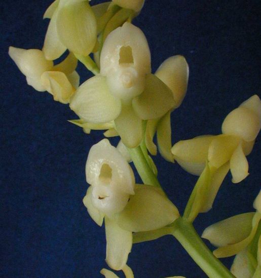 Found in eastern Panama and the western slope of Colombia at elevaaions around 550 meters as a medium sized, warm growing epiphyte with fusiform pseudobulbs carrying several, plicate leaves that blooms in the later spring and summer on a basal, arching, to 14" [35 cm] long, several flowered inflorescence carrying non resupinate, fragrant flowers