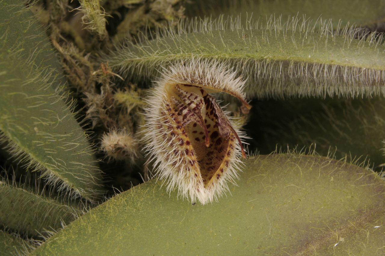 Found in Ecuador and Peru at elevations of 1500 to 1800 meters as a mini-miniature sized, cool growing epiphyte with horizontal to suberect, stout ramicauls enveloped by 2 to 3 pilose, imbricating sheaths and carrying a single, apical, light green, purple suffused beneath, suberect to horizontal, fleshy, verruculose, elliptical, obtuse, basally broadly cuneate and sessile leaf that blooms in the spring on am erect, 1/2 to .57" [1.2 to 1.4 cm] long, succession of single flowers arising from a basal sheath at the base of the leaf and has a tubular, long-pubescent floral bract.