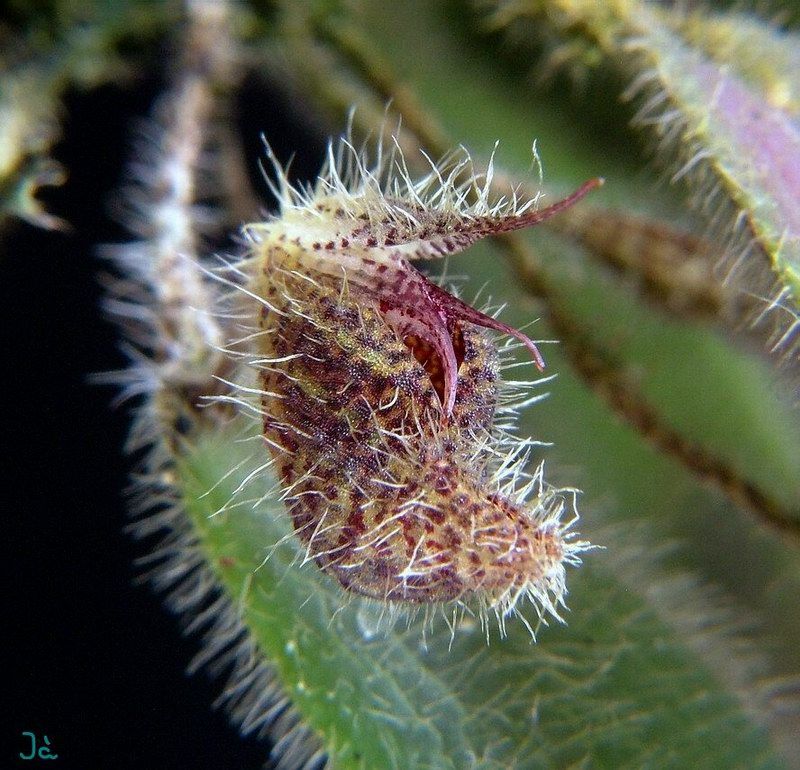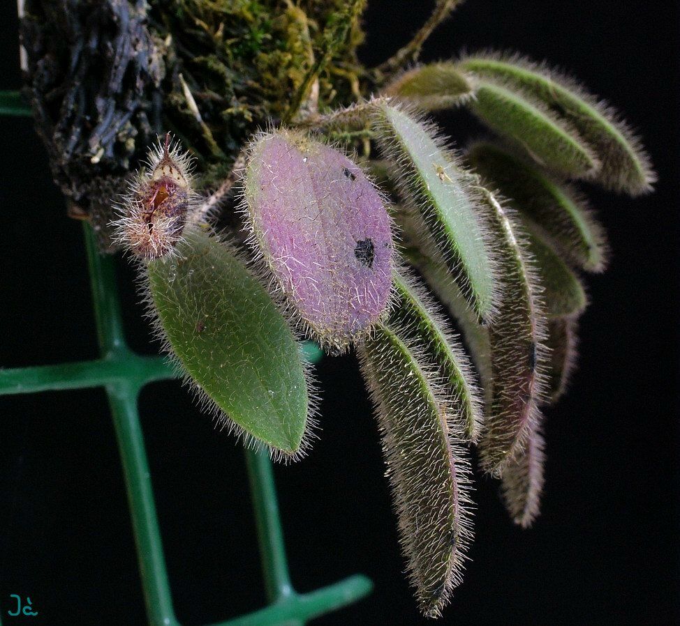 Found in Ecuador at elevations around 1400 meters as a mini-miniiature sized, cool growing epiphyte with a suberect, stout ramicaul enveloped by 3 spotted, sparsely pubescent, tubular, imbricating sheaths and carrying a single, erect in relation to the ramicaul, thickly fleshy, pilose on both sides, elliptical, obtuse, broadly cuneate into the petiolate base leaf that blooms in the spring on a stout, suberect, pubescent, .04" [1 mm] long, successively single flowered inflorescence with a pubescent, tubular floral bract.
