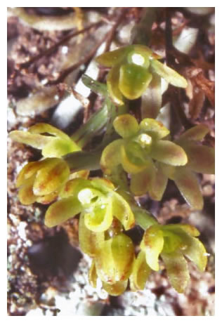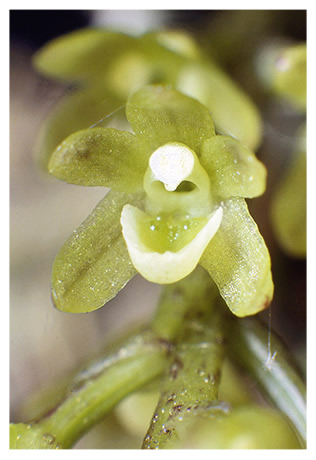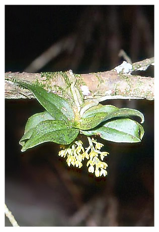 Found in New Zealand in the coastal forests as a mini-miniature sized, cool growing epiphyte with a few, dull yellow green, purple speckled, fleshy leaves that blooms in the late winter through spring on 1 to 3, axillary, paniculate, to 2" [5 cm], to 10 flowered inflorescence holding the flowers under the leaves
