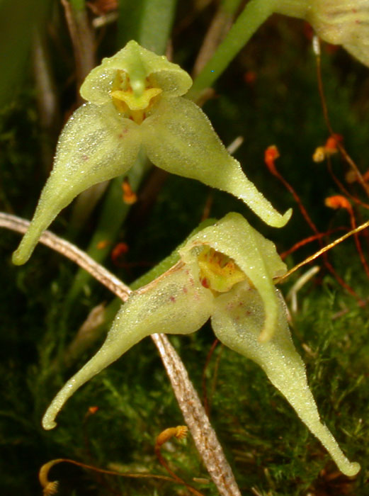 Found in on the western slope of the Andes in Ecuador at elevations 2700 to 3100 meters as a mini-miniature, cold growing epiphyte with erect ramicauls enveloped by 2 to 3, thin, loose tubular sheaths and carrying a single, apical, erect, more or less suffused with purple, narrowly linear, semi-terete, acute, gradually narrowing below into the subpetiolate base leaf that blooms in the spring on a .16 to .2" [4 to 5 mm] long, solitary flowered inflorescence arising through a sheath from low on the ramicaul and has a thin floral bract.