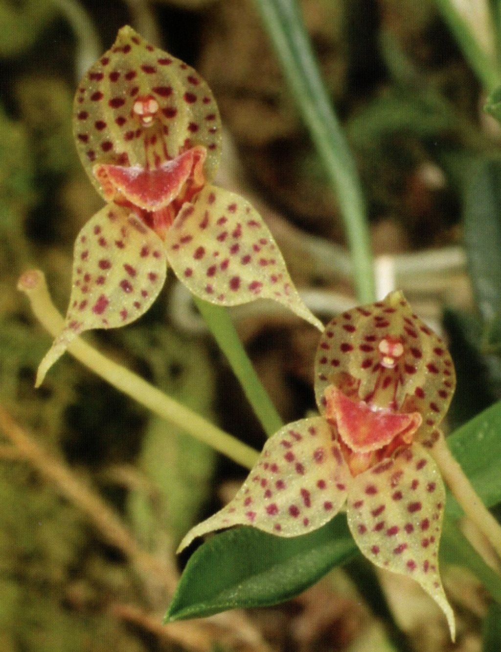"Distinguished by the very narrowly semi-terete leaves and broadly ovate, obtuse sepals with tails about .04" [1 mm]long, Most disitnctive are the oblique, narrowly acute petals obtusely angled on the upper margins and with a short, acute apiculum on the labellar margin. Also unusual for the genus is the long, narrow column and even longer column foot." Luer 1999