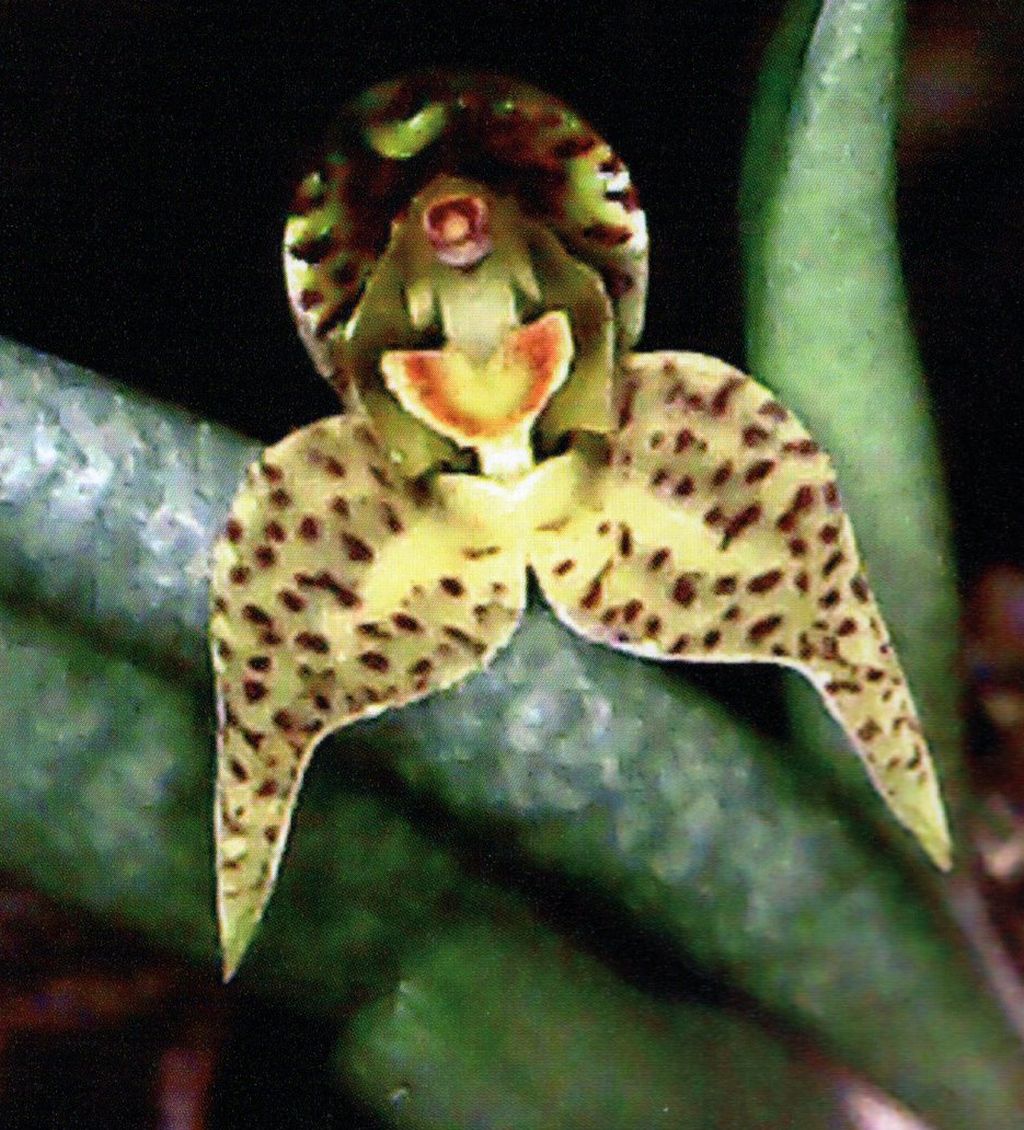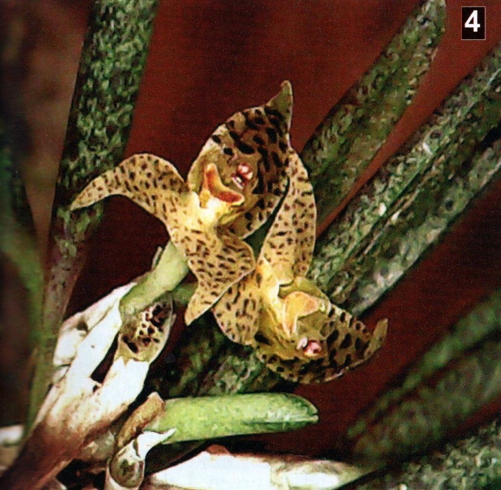 Found in Sao Paulo state of Brazil at elevations around 950 meters as a mini-miniature sized, pseudo-monopodial, pendent, warm to cool growing epiphyte that is attached to the substrate only at the base, with ramicauls enveloped by papery, obliquely truncate sheaths carrying a single, green stained with darker green spots, fleshy, rigid, somewhat trigonus, linear-lanceolate, slightly arched, longitudinally sulcate, attenuate basally leaves that blooms in the late spring and early summer on a short to .32" [8 mm] long, single flowered inflorescence with a membraneous, obliquely truncate apically floral bract and carrying a very small, fleshy, glabrous flower.