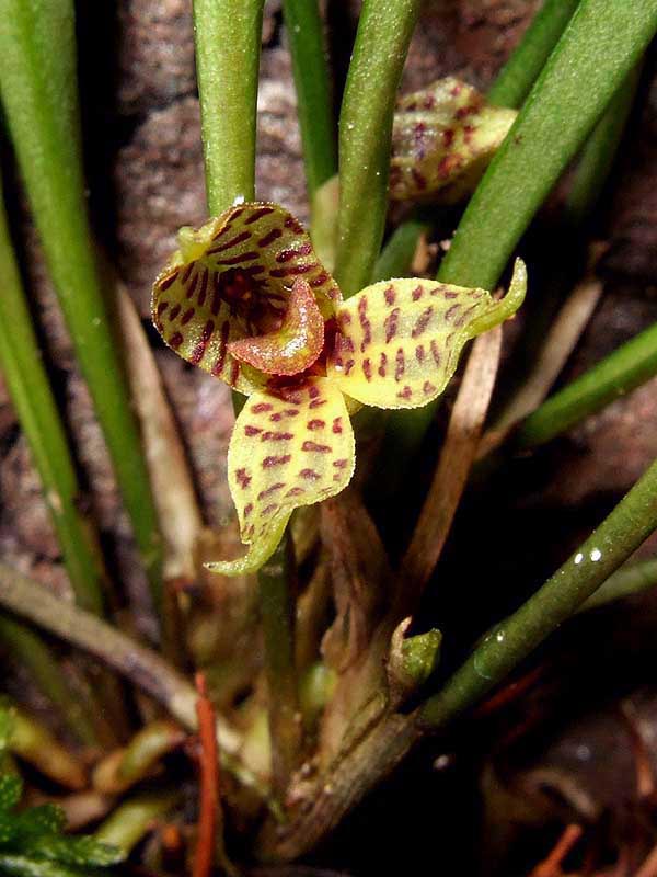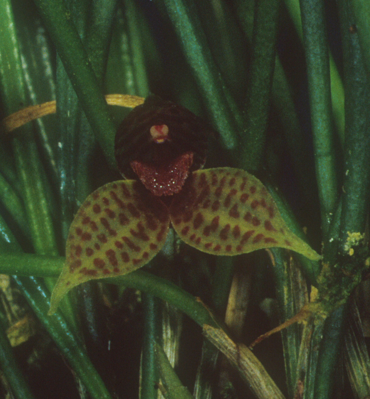 Found in northwestern Ecuador at elevations in scrub vegetation 2600 to 3200 meters as a mini-miniature sized, cold growing epiphyte with erect ramicauls partially enveloped basally by 2 to 3 loose, tubular sheaths and carrying a single, apical erect, coriaceous, narrowly elliptical-obovate, acute to subacute, gradually narrowing below into the subpetiolate base leaf that blooms in the fall on a low on the ramicaul, .04 to .08" [1 to 2 mm] long, congested, successively single, few flowered, racemose inflorescence enveloped by a sheath and has thin imbricating floral bracts.