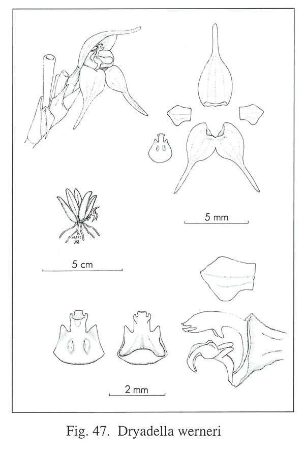 "This species is most similar to the Brazilian Dryadella lilliputiana, but distinguished from the latter by shorter tails; a short, thick claw of the lip; and a dentate column. Dryadella werneri is characterized by the small, densely caespitose habit with thick, semiterete to fusiform leaves. The leaves, broadest below the middle, are con-tracted at the base into a very short pedicel and ramicaul. The flowers are produced in a con-gested, successively flowered raceme. The tails of the sepals are thick and about as long as the blade. The margins of the petals are broadly an-gled. The claw of the lip is short and broad. The column bears a pair of retrorse processes near the middle, while the apex is denticulate." Luer 2001