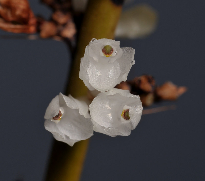Found in Fiji, New Caledonia, Samoa and Vanuatu in montane forests at elevations of 300 to 1100 meters as a large to giant sized, hot to warm growing epiphyte with clustered, ovoid pseudobulbs enveloped completely by persistent leafless sheaths and carrying distichous, arranged in a fan, lanceolate-linear, unequally bilobed apically, becoming conduplicate towards the base leaves that blooms at most any time of the year on a terminal, 25" [62.5 cm] long, racemose, many flowered inflorescence with many, all along the top 1/2, distichously arranged, .4" [1 cm or less] long, 4 flowered branches.