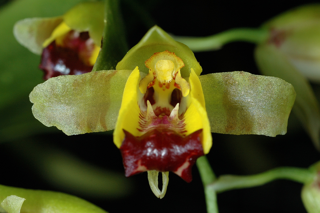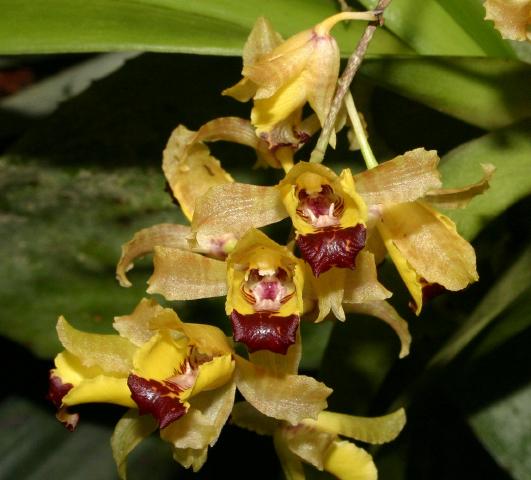 This is a small sized, cool to hot growing epiphyte, native to Minas Gerais, Espirito Santo, Rio de Janiero, Sao Paulo, Parana and Santa Catarina Brazil in montane rainforests at elevations of 50 to 1200 meters that has narrowly ellipsoidal or subcylindric, compressed pseudobulbs partially enveloped basally by several distichous, imbricating, leafless sheaths carrying 1 to 2 apical, oblong-lanceolate, narrowly elliptic or obovate, acute leaves that blooms in the winter on a 1 1/2' [45 cm] long, pendulous, mottled with dull crimson, paniculate [2 to 6 flowers per branch]or racemose, densly many flowered inflorescence with papery, elliptic, obtuse floral bracts and has numerous small flowers.