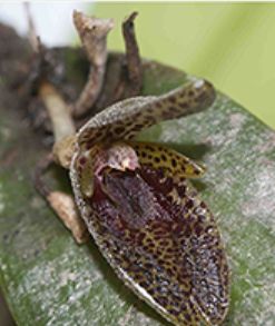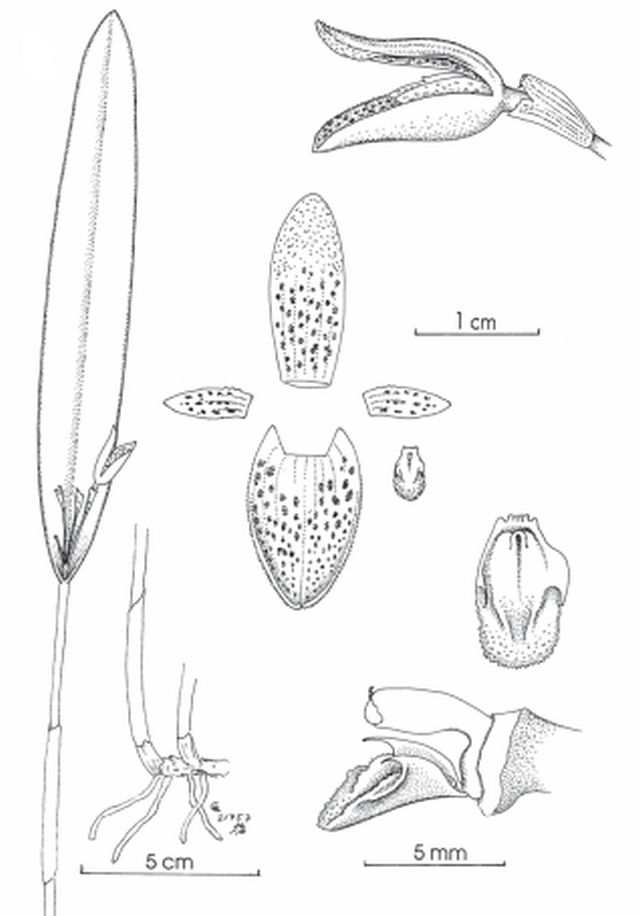 "This species is characterized by stout, erect ramicauls with thick, narrowly elliptical leaves, and a solitary flower borne by a short peduncle. The sepals and petals are fleshy and diffusely spotted with dark purple. Most unusual are the uncinate lateral lobes of the lip with subulate tips pointing forward." Luer & Toscano 2012