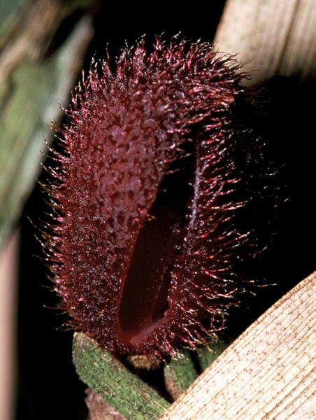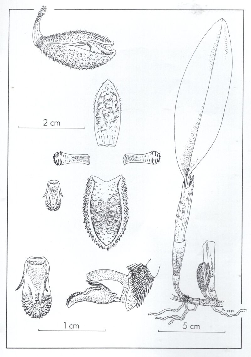 Found in Costa Rica in cloud forests at elevations around 2000 meters as a small sized, cool to cold growing epiphyte with stout ascending ramicauls enveloped basally by 3 to 4 loose, imbricating tubular sheaths carrying a single, apical, erect, thickly coriaceous, elliptical, subacute leaf that is cuneate below into the conduplicate, sessile base and blooms in the spring and fall on a single flowered, short inflorescence that arises from any of the lower nodes on the ramicaul or rhizome and carrys a non-resupinate flower.