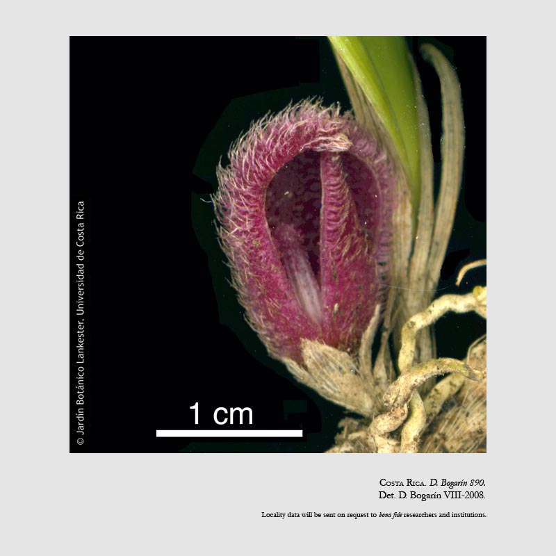 Found in Nicaragua, Costa Rica, Colombia, Venezuela and Ecuador at elevations of 300 to 1700 meters as a mini-miniature sized, hot to cool growing epiphyte with erect stout ramicauls enveloped by 3 loose, imbricating., tubular sheayths and carrying a single, apical, erect, coriaceous, narrowly ovate, acute, cuneate below into the conduplicate, sessile base leaf that blooms in the spring and summer on a single, .15" [3 mm] long, pubescent inflorescence arising from any of the lower nodes on the ramicaul and rhizome and carrying non-resupinate, pubescent flowers