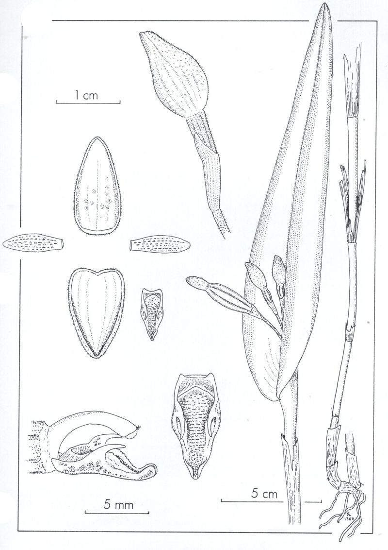 Found in Costa Rica and Panama at elevations around 1500 to 2200 meters as a small sized, cool to cold growing epiphyte with stout, erect ramcauls enveloped by 6 to 8, loose, tubular sheaths and carrying a single, apical, erect, thickly coriaceous, narrowly elliptical to narrowly ovate, acute, cuneate below into the conduplicate, sessile base leaf that blooms in the late fall and winter on a fascile of pubescent,.8 to 1.6" [2 to 4 cm] long, successively single, few flowered inflorescence arising through a spathe at the apex of the ramicaul with inflated floral bracts and carrying cleistogamous flowers that never open.