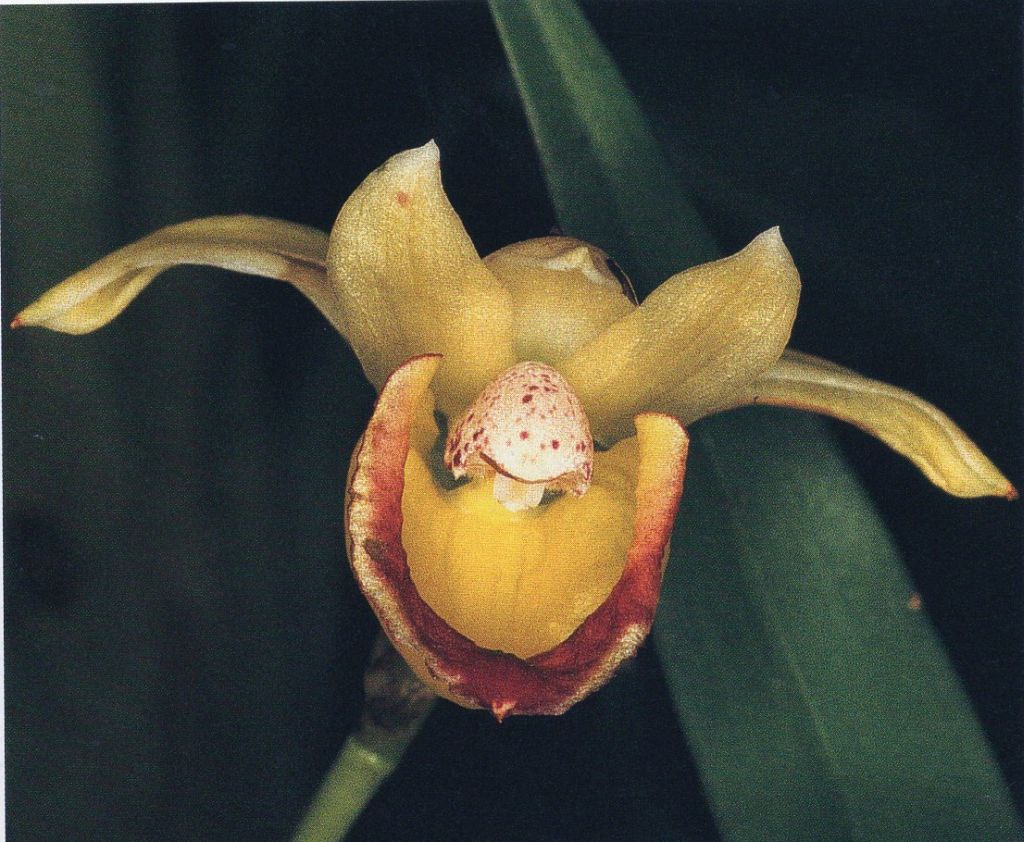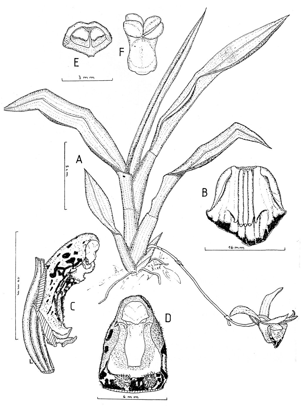 Found in southern montane Colombia and northern Ecuador in cloud forests at elevations around 1800 meters as a medium sized, cool growing epiphyte with a fan of about 5, varying sized, narrowly lanceolate, acute, articulate to the leaf sheaths below leaves that blooms in the fall on an axillary, 4" [10 cm] long, single flowered inflorescence