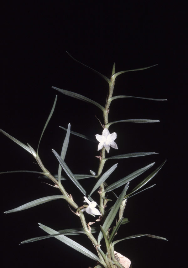 Found in Gabon and Cameroon at elevations around 570 meters as a mini-miniature sized, warm growing epiphyte with very slender stems in tufts carrying narrow, linear, basally twisted so as toall lie in one plane, acutely bilobed apically leaves that blooms on an opposite the elaves, .08 to .12" [2 to 3 mm] long, 1 to 2 flowered inflorescnce with small ovate floral bracts and carrying transluscent white flowers.