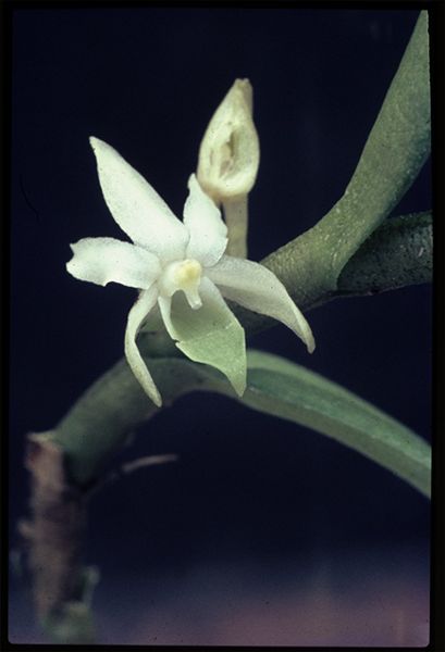 Found in Uganda at elevations around 1300 to 1950 meters in rainforests and rarely on Lava flows as a miniature to medium sized, warm to cool growing epiphyte or rarely lithophyte with a pendant to arcuate, occasionally branching stems carrying towards the apex, fleshy, coriaceous, narrowly oblong-lanceolate, inequally rounded to obtuely bilobed apically, basally twisted so as to all lie in one plance, articulated to the base leaves that blooms in the spring on subsessile, .16 to .22" [4 to 6 mm] long, 2 to 3 flowered, fractiflex inflorescence with fragrant flowers