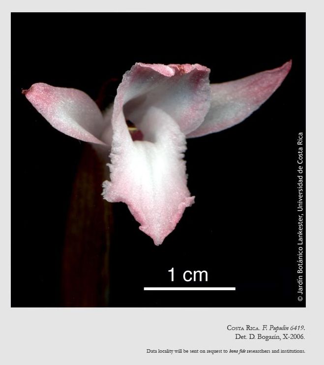 Found in Costa Rica, Colombia, Venezuela, Ecuador and Brazil, at the forest border, in shady places around 900 meters as a miniature to small sized, warm growing, deciduous leafed terrestrial with 3 to 6, patent to erect-patent, elliptical, acute to rounded and apiculate, deeply canaliculate, glabrous dark green leaves in a basal rosette with white spotting and blooms on a terminal, erect, terete, glabrous, 6" to 16" [15 to 40 cm] long, few to many flowered inflorescence almost completely enveloped by several loose, inflated, acuminate bracts and floral bracts beneath each flower.