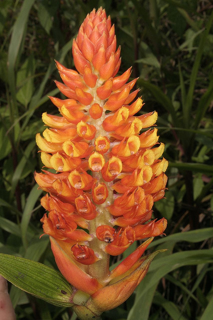 Found in Venezuela, Colombia and Ecuador at elevations of 600 to 1300 meters as a medium to just large sized sized, warm to cool growing terrestrial with stiffly erect stems that are leafless below and leafy above, carrying loosely several, subcoriaceous, strigose-punctate beneath, plicate, lanceolate, acute, long acuminate, abruptly narrowing below into the basally clasping leaves that blooms at most any time of the year on a terminal, sessile, elongate rachis, arcuate-recurved, slightly longer than the terminal leaf, spirally arranged, elongate, 3.2" [8 cm] long, densely many flowered inflorescence carrying orange flowers with cymbiform, ovate, obtuse bracts.