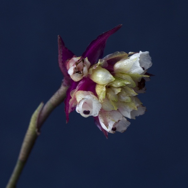 Found in Zamora-Chinchipe Ecuador at elevations around 1500 meters as a small sized, cool growing epiphyte with erect, unbranched, leafless in the lower half stems carrying 5 to 7, variable in size and shape, coriaceous, narrowly ovate-elliptic, subacuminate, minutely 3 lobed apically, mucronate leaves that blooms in the fall on a terminal, fractiflex, furfuraceous, .6" [1.5 cm] long, loosely 5 to 7 flowered inflorescence with distichous, horizontally spreading, glumaceous, long acuminate, glabrous, basal bracts longer than the flowers, apically shorter bracts.