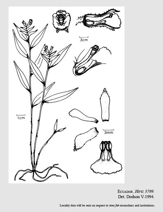 References W3 Tropicos, Kew Monocot list , IPNI ; *Orquideología Vol 19 #2 pg 134-136 Dodson 1994 drawing fide; Native Ecuadorian Orchids Vol 2 Dodson 2001 drawing/photo fide to the first photo; Flora of Ecuador No 87 225[3] Orchidaceae Dodson & Luer 2010 drawing fide to the first photo