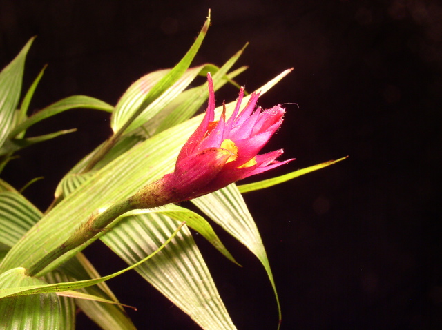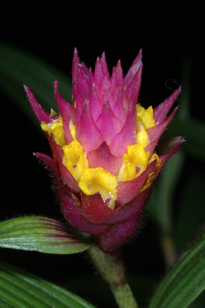 Found in The Windward Islands, French Guiana, Surinam, Guyana, Venezuela, Colombia, Ecuador, Peru and Bolivia in mossy primary wet forests at elevations around 200 to 1600 meters as a medium to large sized, hot to cool growing epiphyte or terrestrial with reed like, terete, slender, hairy stems carrying several, plicate and heavily pleated, hairy beneath, linear-lanceolate, long-acuminate, basally clasping leaves and blooms in the late spring through early fall on an apical corymb and carry several to many flowers that open successively over a few days and are almost enveloped by the elongate, reddish purple floral bracts .